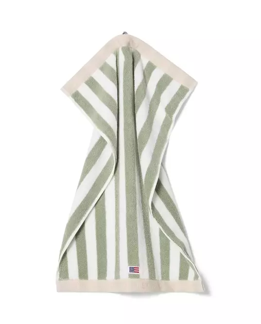 Det klassiske blokkstripete håndkleet i vintage grønn, hvit og moonbeam gir en frisk, tidløs estetikk til badet ditt. Laget av 100% høykvalitets 600g ringspunnet bomullsfrotté, er dette håndkleet både mykt og svært absorberende. Det sofistikerte blokkstripede designet har en brettet kontrastkant med jacquard-tekstlogo på topp og bunn, mens en vevd Lexington-logo nederst foran gir et autentisk preg. Oeko-tex-sertifisert for din trygghet.