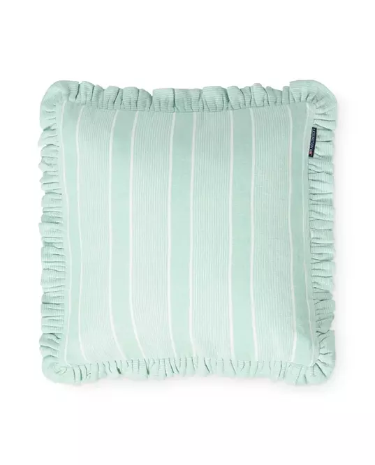 Stripet lin/bomull putetrekk med volang, grønn/hvit